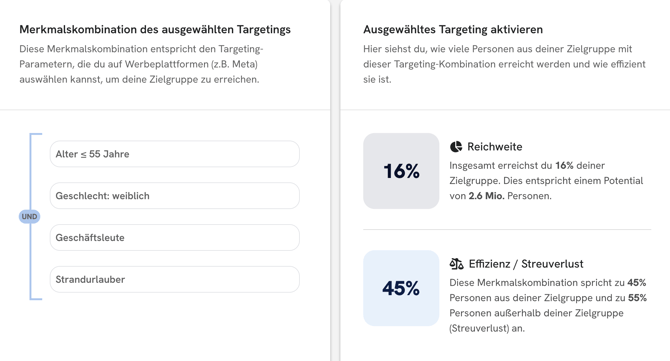 Diese Seite zeigt dir, welche Parameterkombinationen (z. B. für Meta, Google, YouTube oder Connected TV) die höchste Relevanz und Reichweite für deine Zielgruppe haben.